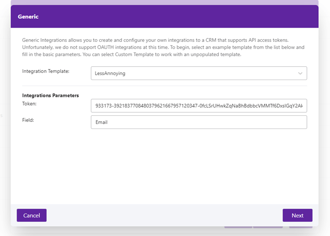 Each supported CRM uses a user-generated personal API token which grants access to their APIs for users. This token is mandatory and must be added to the request.